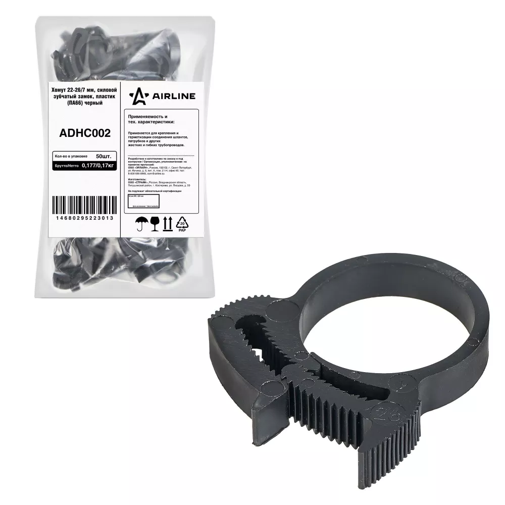 Хомут 22-26/7 мм, силовой зубчатый замок, пластик (ПА66) черный