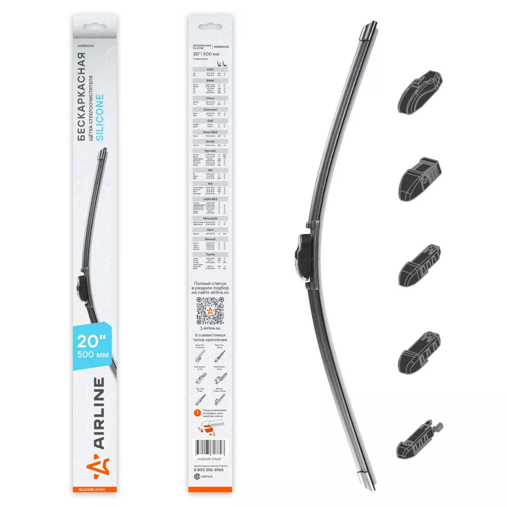 Купить в Омске AWBBS008 Щетка стеклоочистителя бескаркас SILICONE 500мм (20") 5 адаптеров производитель Airline Выгодные цены и быстрая доставка - Применимость и аналоги - Cкидки и акции